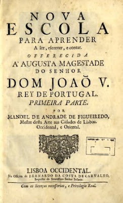 Nova Escola para aprender a ler, escrever, e contar... primeira parte / por Manoel de Andrade de Figueiredo, Mestre desta Arte nas cidades de Lisboa Occidental, e Oriental. - Lisboa Occidental : na Officina de Bernardo da Costa de Carvalho, impressor do Serenissimo Senhor Infante, 1722. - [18], 156 p., 44 f. gravadas a buril : il. ; 2º (31 cm)